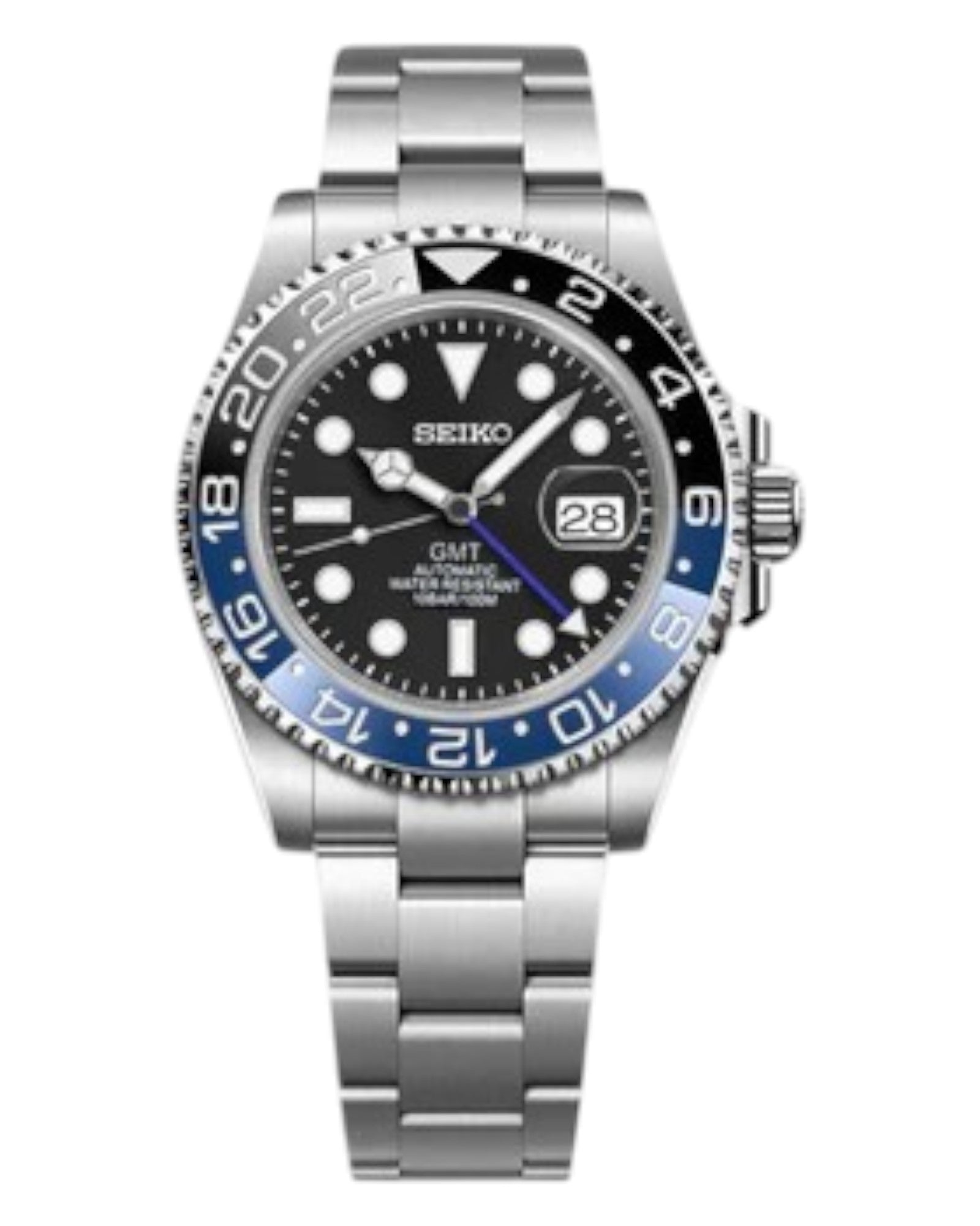Inspired by the iconic GMT design, this Seiko Mod is driven by the reliable Seiko NH34 automatic movement. Its versatile 40mm case offers refined craftsmanship and everyday comfort. Paired with your choice of Jubilee or Oyster bracelet, this GMT mod blends timeless style, precision, and accessibility for the modern collector.