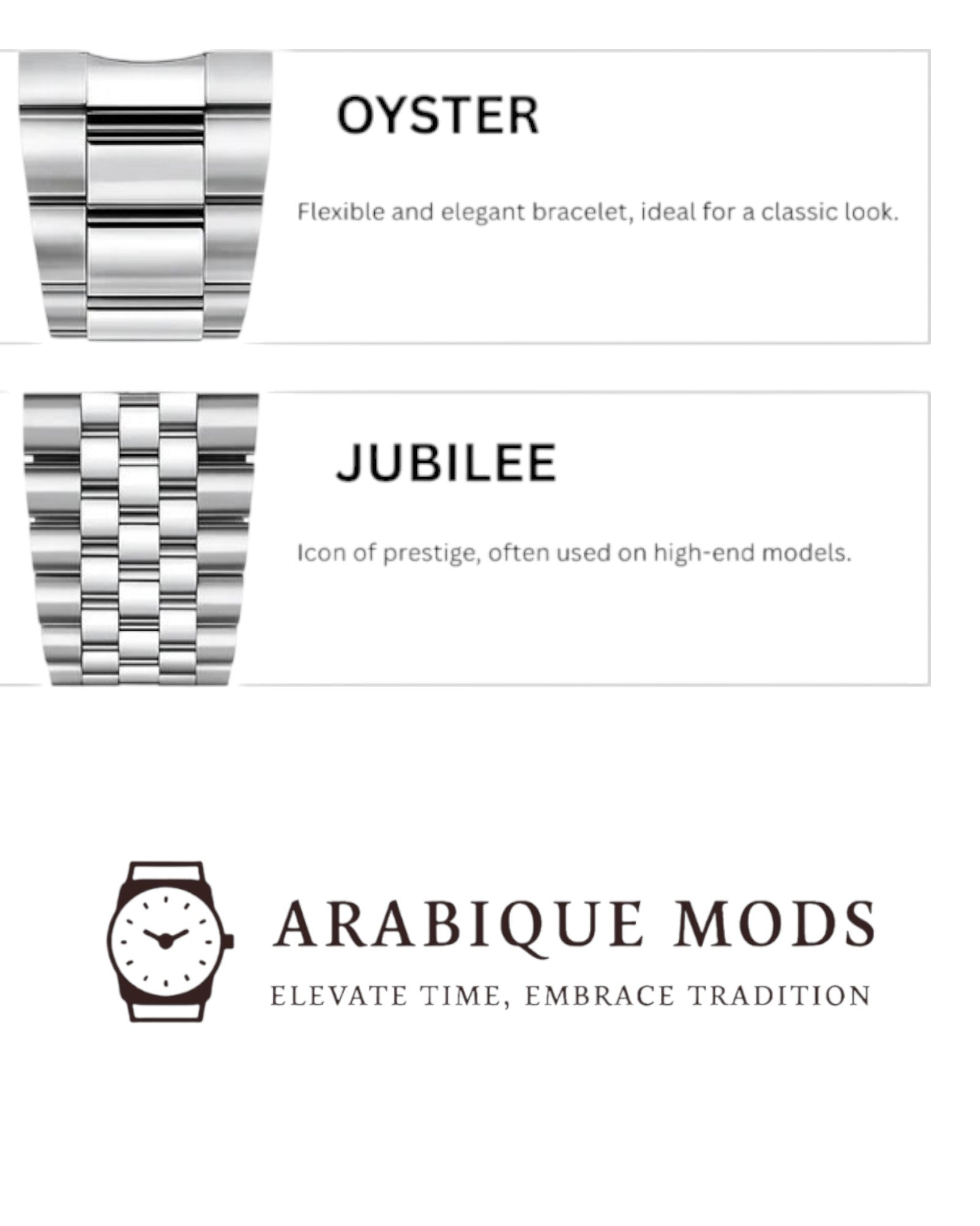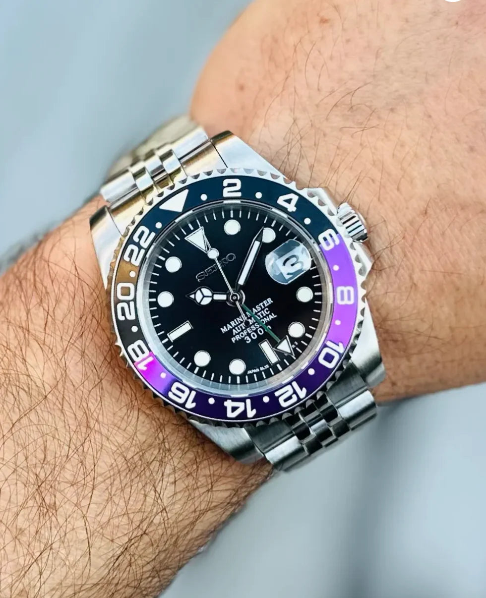 Inspired by the iconic GMT design, this Seiko Mod is driven by the reliable Seiko NH34 automatic movement. Its versatile 40mm case offers refined craftsmanship and everyday comfort. Paired with your choice of Jubilee or Oyster bracelet, this GMT mod blends timeless style, precision, and accessibility for the modern collector.