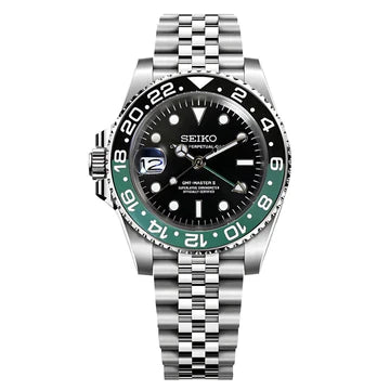 Inspired by the iconic GMT design, this Seiko Mod is driven by the reliable Seiko NH34 automatic movement. Its versatile 40mm case offers refined craftsmanship and everyday comfort. Paired with your choice of Jubilee or Oyster bracelet, this GMT mod blends timeless style, precision, and accessibility for the modern collector.