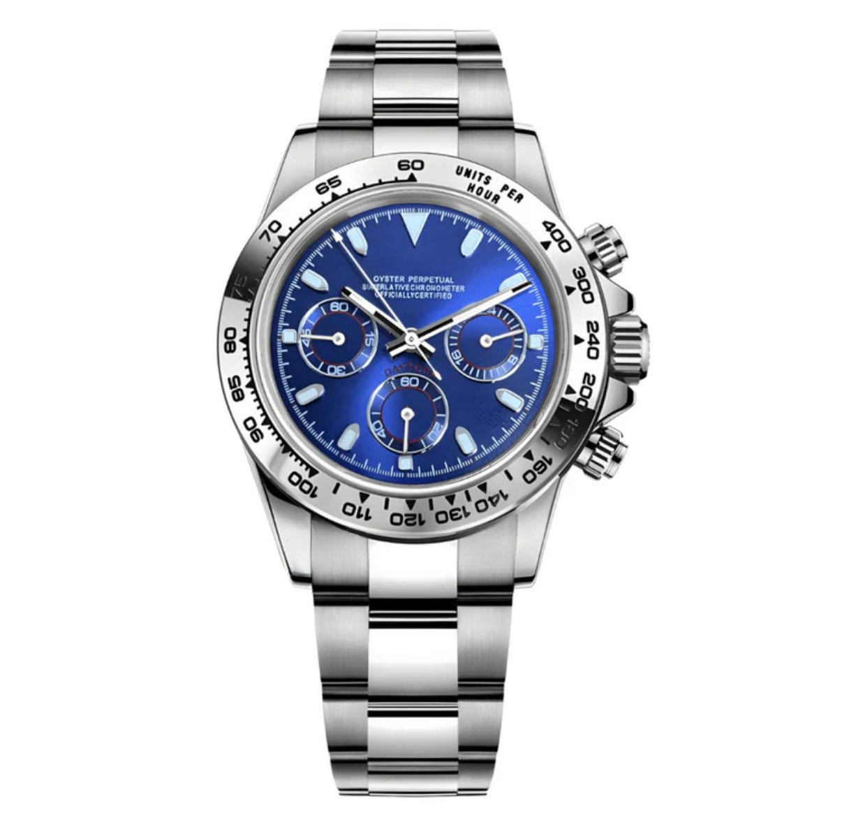Inspired by the legendary Daytona design, this Seiko Mod showcases the renowned Seiko VK63 hybrid movement. At 40mm, it delivers premium quality, blending refined craftsmanship with accessible luxury. Available with your choice of a Jubilee or Oyster bracelet, this timepiece delivers both Style and versatile comfort.